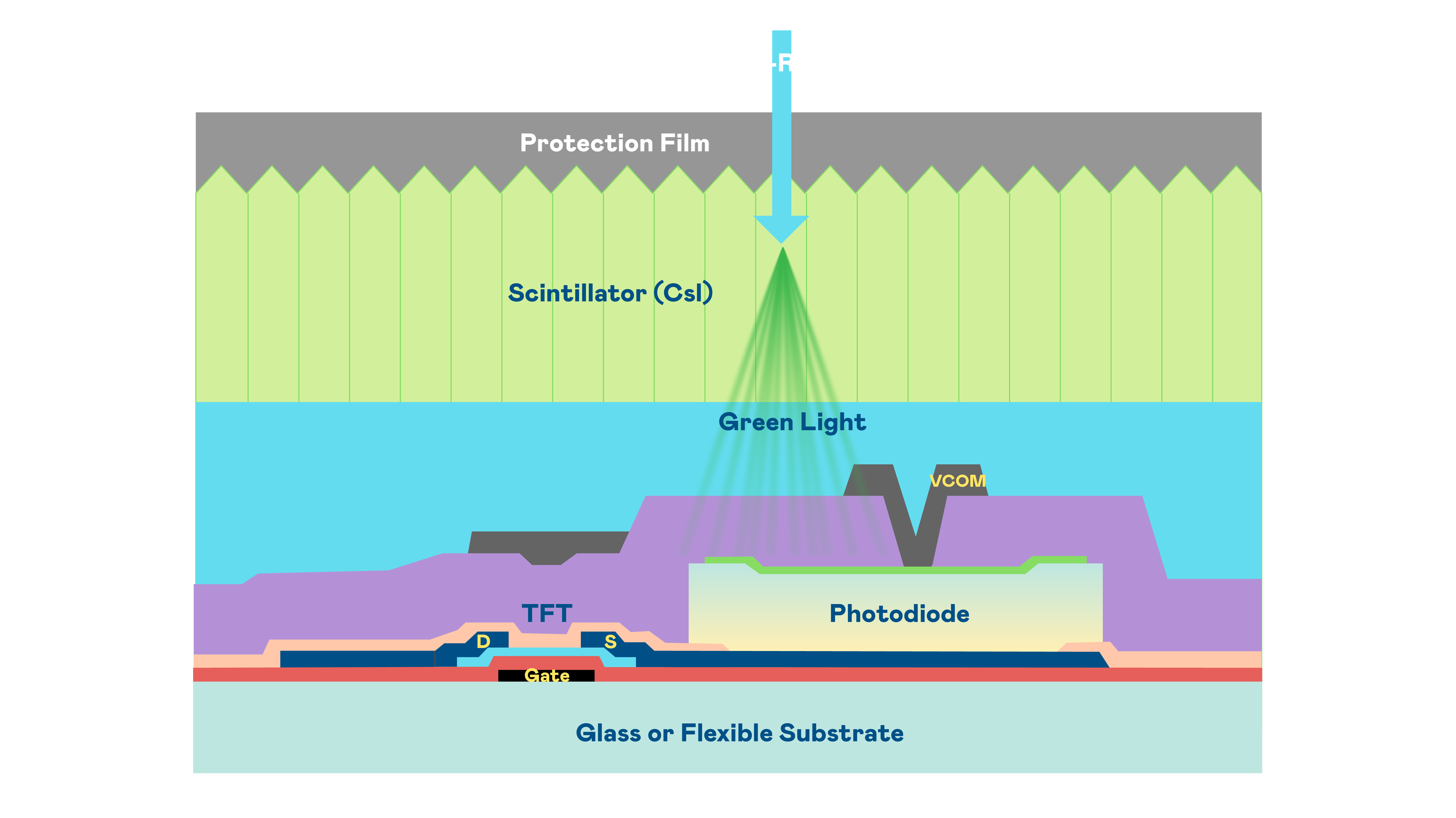 星空电子的X光影像感測陣列使用薄膜電晶體 (TFT) 作為每個像素的讀取開關,搭配光電二極體(Photodiode)的光電轉換元件,用以感測X光影像訊號。